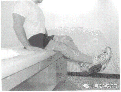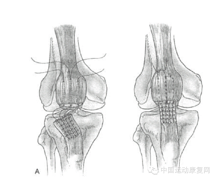 手术概述   一、髌腱断裂修复   多数髌腱断裂发生于骨骼与肌腱接合处,髌腱体部断裂很少出现,并且这种断裂很难修复。髌腱撕裂可以用不可吸收缝线将肌腱的内、外两部分缝合。先打一个横跨髌骨下级的骨道,在髌骨上方和下方分别钻几个孔,然后将缝线从下方穿入,在上方穿出并且打结(图1—A)。体部撕裂修复可使用交锁缝合,连接髌腱的远近端(图1—B)。如果需要的话,可以使用环扎缝线、同种异体肌腱移植或者膝关节周围肌肉组织,以加强修复的效果。         图1髌腱断裂修复。A.撕裂修复B.体部断裂修复   二、股四头肌肌腱断裂修复   股四头肌腱断裂常见于髌骨上极骨骼肌腱接合处。凿一个水平通过髌骨上极的骨道,在靠近骨道底部的位置钻孔,将缝线由肌腱穿过通过钻孔后再缝合于肌腱(图2)。急性体部撕裂可以直接修复,使用正中切口,清理远近断端,然后用不可吸收缝线将两个断端缝合,拉紧打结。      图2急性股四头肌腱断裂修复   康复概述   在股四头肌腱或者髌腱断裂修复术后,将患者的下肢置于锁定在0度伸直位的膝关节康复支具中。在不复杂的急性伸膝装置断裂修复后,如果患者可以耐受,将支具锁定于完全伸直位下逐渐负重。   髌腱及股四头肌腱断裂修复术后康复治疗主要分为以下几个阶段:   术后第一阶段:最大程度保护(第0~6周)   目标   ·控制术后疼痛和肿胀   ·使患者本人理解修复部位需要严格保护   ·逐渐增加膝关节屈曲角度(医生指导下)   比如:0~3周由0°增加至45°,4~6周由45°增至90°   ·避免发生股四头肌抑制   ·独立进行家庭治疗练习计划(HEP)   注意事项   ·避免膝关节主动伸直(图3)      ·保持支具的正确对线   ·避免在支具没有锁定于0°位时行走   ·避免强行屈膝,遵守医生规定的关节活动度限制   治疗措施   ·冰敷   ·教会患者如何使用支具(锁定,仅在关节活动度练习时解锁)   ·持续被动活动设备CPM   ·坐位主动和辅助下主动膝关节屈曲练习,被动伸直(图4)   如果患者遵守膝关节活动度限制,可在去除支具的情况下进行练习      ·股四头肌再训练(神经肌肉电刺激下或生物反馈下股四头肌次强收缩)   ·多角度股四头肌等长收缩   ·将支具锁定于0°直腿抬高   ·瘢痕松动术   ·髌骨松动术   ·步态训练:将支具锁定于完全伸直位,使用拐杖在可以耐受的情况下 渐进性负重,然后进展到将支具锁定于伸直位,使用手杖在可以耐受的情况下负重   ·如果需要,用上肢肌力练习仪(UBE)来训练心血管系统   晋级标准   ·关节活动度达到0°~90°   ·髌骨活动度良好   ·直腿抬高不出现迟滞   ·支具锁定于0°伸直位,使用手杖无痛负重   术后第二阶段:中度程度保护(第6~11周)   目标   ·将疼痛和肿胀降到最低限度   ·使患者理解活动限制   ·恢复膝关节屈曲活动度至125°   ·在不使用辅助设备的情况下恢复正常步态   ·患者能登上500px高的台阶   注意事项   ·避免过度肌力练习   ·避免因活动等级增加多快而增加膝关节渗出和疼痛   ·避免过度屈膝关节活动度练习   治疗措施   ·冰敷   ·步态训练:—旦患者达到良好的股四头肌控制,可将支具的60°屈曲锁定解除   ·去除支具(股四头肌控制良好,与医生沟通)   ·水池中行走或水下踏车系统行走   ·主动或辅助下主动膝关节屈曲练习   ·继续进行髌骨松动术   ·腿部蹬踏器(双侧),如果关节活动度大于90°可进展到离心及单侧(图5)      ·离心腿部蹬踏。当腿部控制改善后,进行离心腿部蹬踏练习   (双侧蹬踏练习中大约使用60%的体重)。   ·当膝关节屈曲达到110°~115°时可使用正常正常自行车(标准柄长)   ·开始向前上台阶练习   ·开始静蹲练习,在舒适范围内滑墙练习   ·本体感觉练习(图6)      ·逆向行走   ·开始股四头肌柔韧性练习   晋级标准   ·关节渗出减少至消失   ·膝关节屈曲活动度至少达125°   ·正常髌骨活动度   ·良好的下肢控制——无伸膝迟滞   ·能登上500px高的台阶   ·正常及对称的步态姿势   术后第三阶段:早期功能恢复(术后第11~16周)   目标   ·完全膝关节活动度   ·增加股四头肌和下肢柔韧性   ·在良好的离心控制下走下500px高的台阶   ·恢复正常的日常生活活动   ·在向前下台阶(FSD)测试中达到85%的肢体对称性   ·独立进行家庭/健身房治疗练习计划   注意事项   ·避免在每日活动和治疗练习中引起疼痛   ·在达到充分的股四头肌力量和下肢控制之前避免下台阶练习   ·在达到充分的关节活动度、肌力和柔韧性之前避免高级别的体育活动   治理措施   ·继续膝关节屈曲活动度练习   ·加入股四头肌群柔韧性练习   ·软组织按摩、肌筋膜放松和收缩-放松技术   ·进一步闭链练习:进一步台阶计划   ·开始向前下台阶练习   ·渐进性静蹲练习   ·如果可以耐受,加入开链伸膝练习(等速/等长)   ·高一级本体感觉练习   ·灵活性训练   ·踏步机训练   ·逆向跑   ·术后4个月进行向前下台阶测试   ·患者重复和遵守家庭/健身房治疗计划   晋级标准   ·到达完全膝关节活动度   ·充分的股四头肌力量和下肢柔韧性   ·具有良好的离心腿部控制,能走下500px高的台阶   (在向前下台阶测试中达到85%的肢体对称性)   ·在日常生活活动中——行走及双向台阶跨越,保持无痛   ·遵守家庭/健身房治疗练习计划   术后第四阶段:晚期功能恢复/重反体育运动(第16~24周)   目标   ·不惧怕专项体育运动   ·肌力和灵活