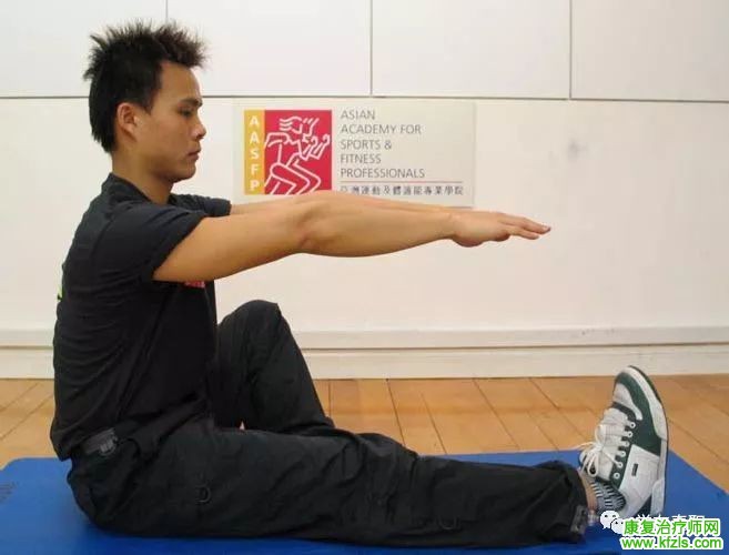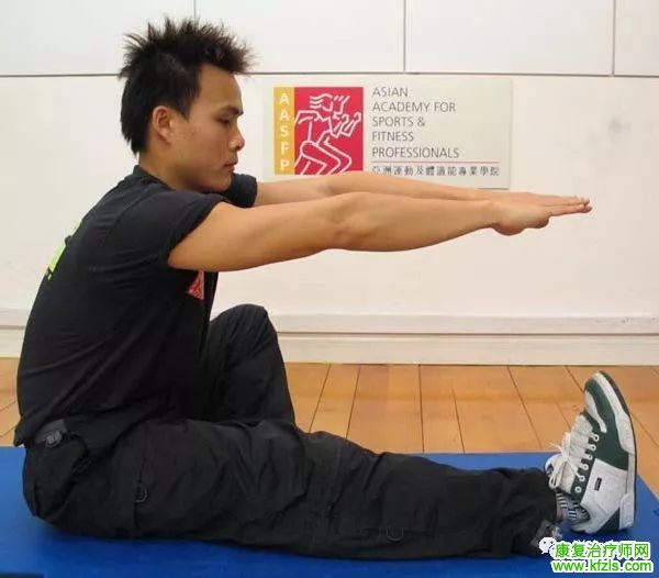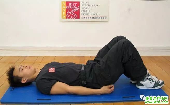 1、卷腹 目标肌肉:腹部肌肉 开始体位:仰卧,髋屈曲45度,膝关节屈曲90度,双脚平放地面,两手分别置于对侧肩膀,下颌微收。 动作:缓慢卷起身体并同时吸气,直至肩部离开地面,然后呼气还原。重复次数:每星期 3-4次,每次3组,每组10次。 进阶:双臂交叉或将双手置于头侧。(图2、图3)